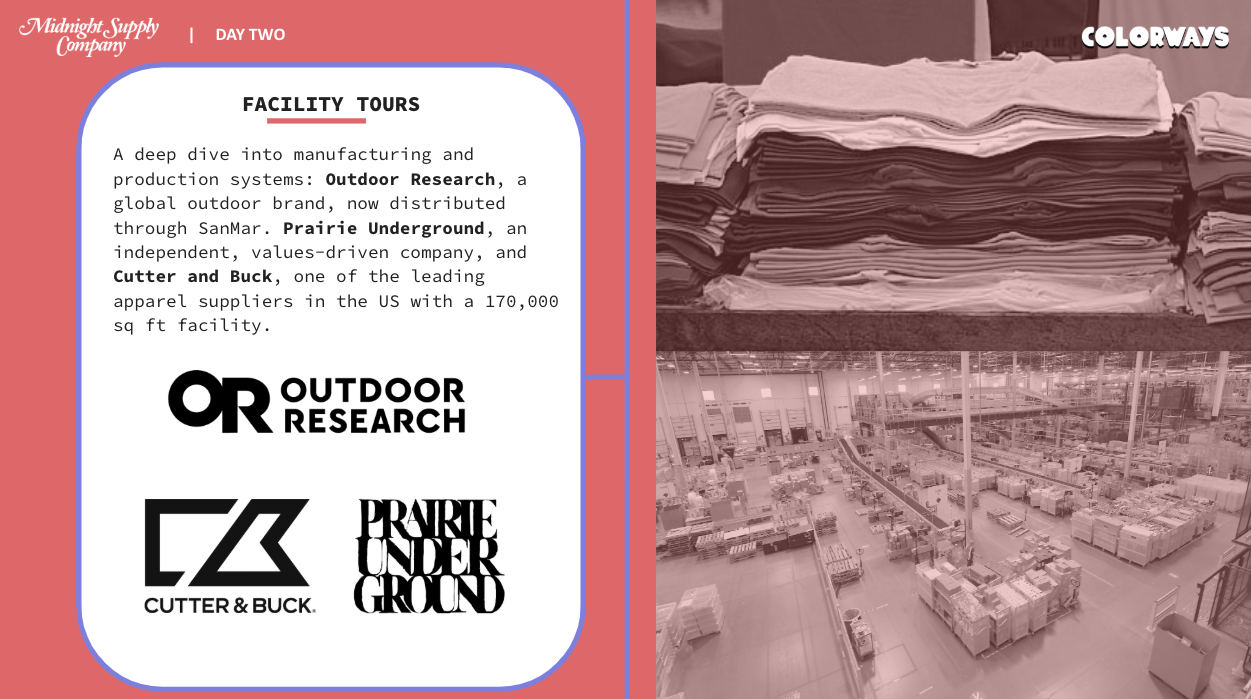 This year’s program offers an inside look at how products are made, featuring perspectives from Outdoor Research, a global outdoor brand, and Prairie Underground, a smaller , values-driven company. Attendees will also experience an exclusive shop tour of Cutter & Buck’s 170,000 square foot facility.