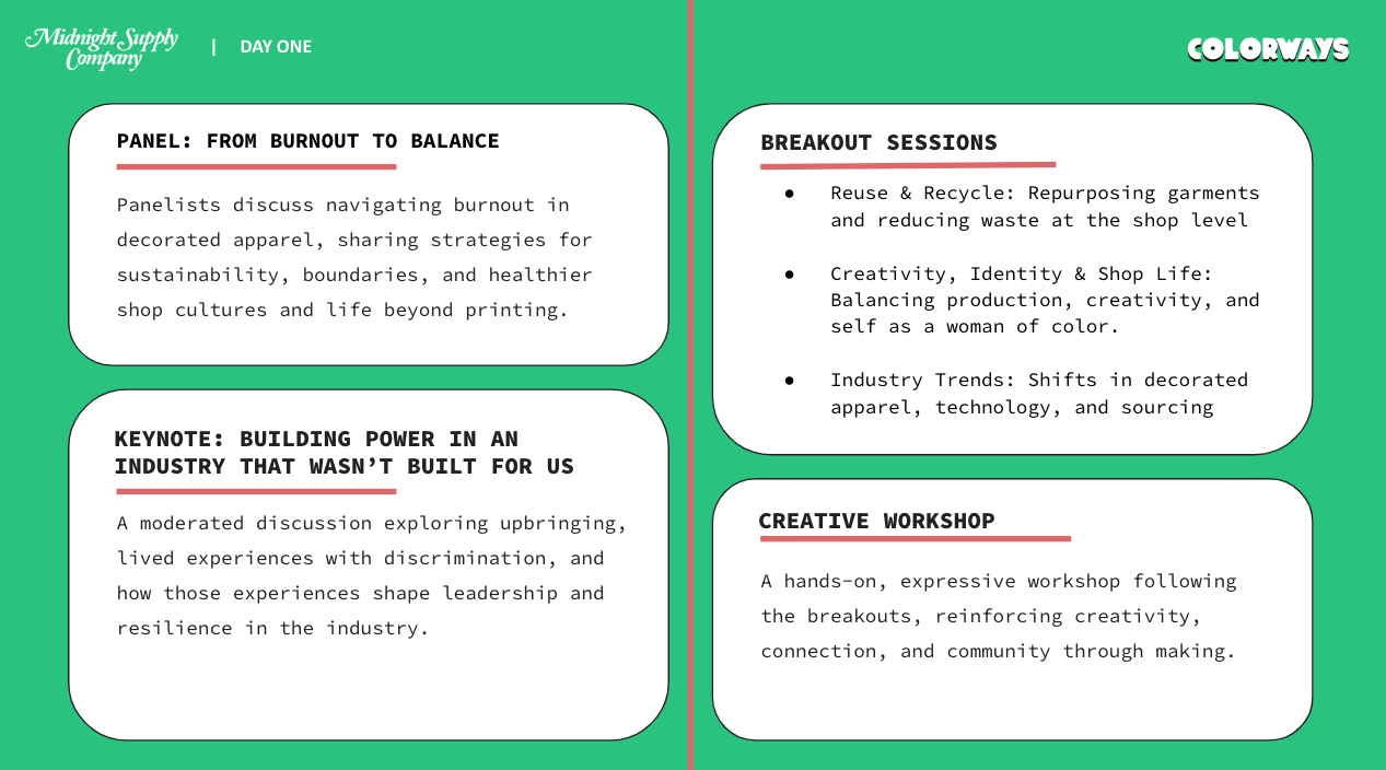 The event kicks off at Midnight Supply Company with panel discussions, breakout sessions and a hands-on workshop designed to spark conversation and collaboration across the industry.